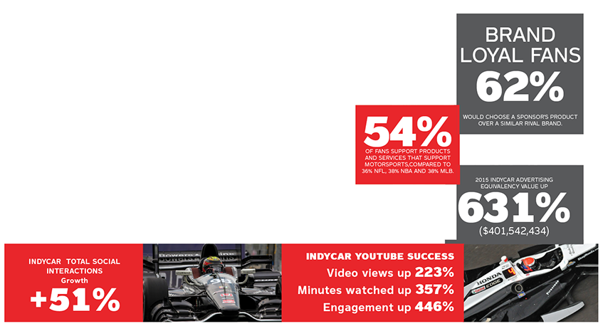 REACH VALUE Attendance averages 100,000 people per event TV COVERAGE – ABC and NBC Sports Global TV Audience in excess of 700 million people Print – 300 million impressions from print media Web-based media – 14.4 billion impressions Sampling of 16,000 Social Media Posts – 93% are positive or neutral An IndyCar team can garner $40 million+ worth of marketing value from TV, Print, Internet, Billboard (Transporter), Radio and Appearances by the car, owners or drivers The 2011 Indianapolis 500 win by Bryan Herta Autosport had an additional $6 Million in Post-Race Marketing Value associated with it For 11 IndyCar telecasts in 2015 on NBCSN, ratings were up 36% and 34% in viewership from 2014 (0.25, 378K) and it was the network’s most-watched IndyCar season since it began airing coverage in 2009. Overall, this season ranks as the most-watched on cable since ESPN and ESPN2 averaged 778,000 in 2008. Source: Sports Media Watch ABC averaged a 1.5 rating and 2.4 million viewers for its